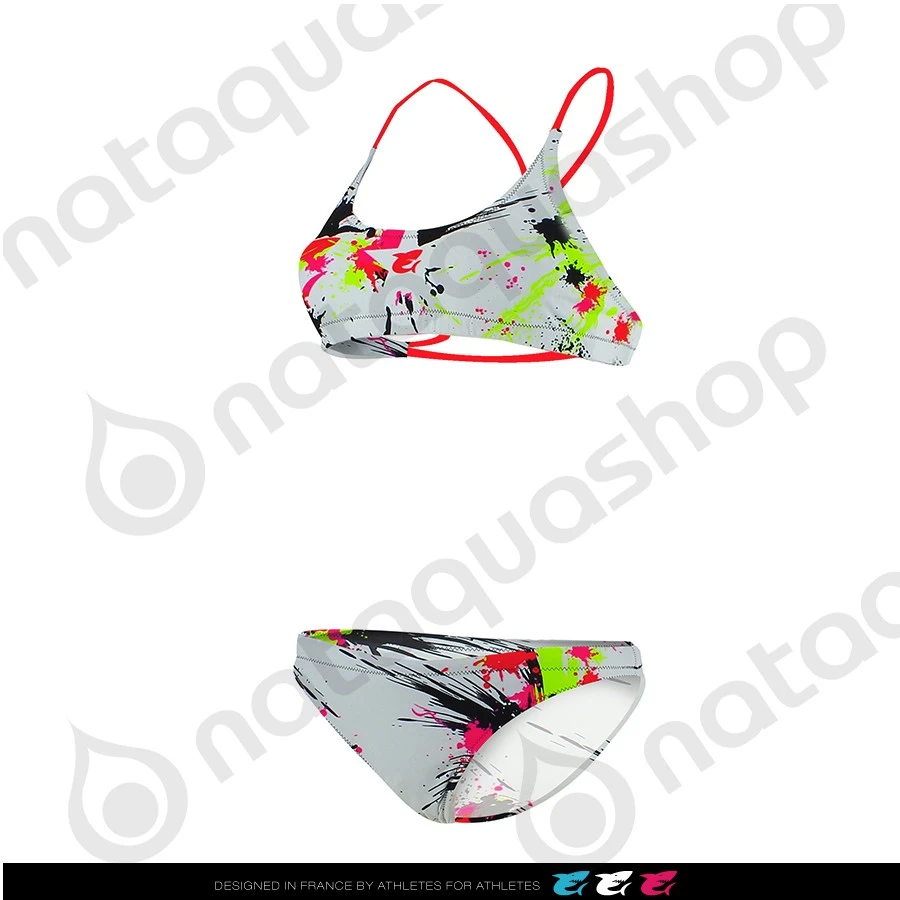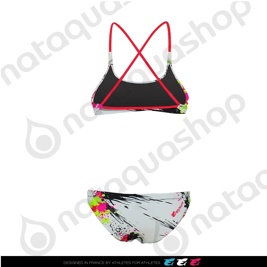 Crazy version Paintball pour ce bikini, fines bretelles croisées dos. Disponible en blanc et noir.