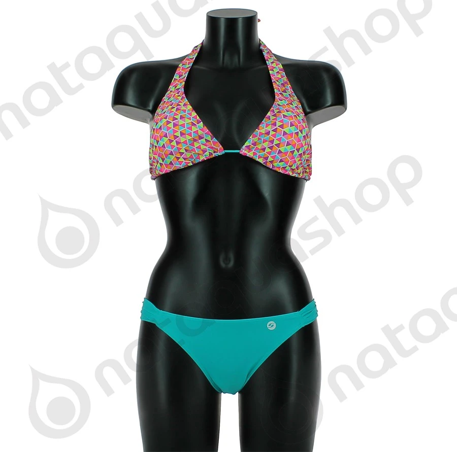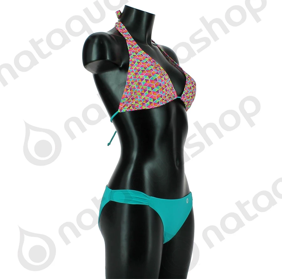 Le BIKINI HALTER HEXAGON est ultra tendance grâce à ses 2 pièces dépareillées: La culotte, bleu lagon unie marque son originalité par sa coupe aux détails très féminins sur les hanches. Le design du triangle se révèle très réussi, des alvéoles pops et colorées donnent la touche de « peps » au maillot de bain. La coupe du décolleté le met particulièrement bien en valeur.