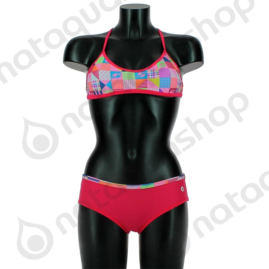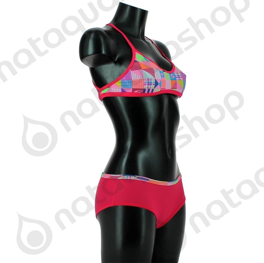 Le BIKINI TOP CASINO séduit grâce à son design original: le motif est composé d’une mosaïque dans les tons de rose ultra girly. La coupe est à la fois féminine et sportive, avec une mini brassière aux fines bretelles croisées et une culotte unie rose fuchsia joliment échancrée; les jeunes filles ne peuvent qu’adorer!