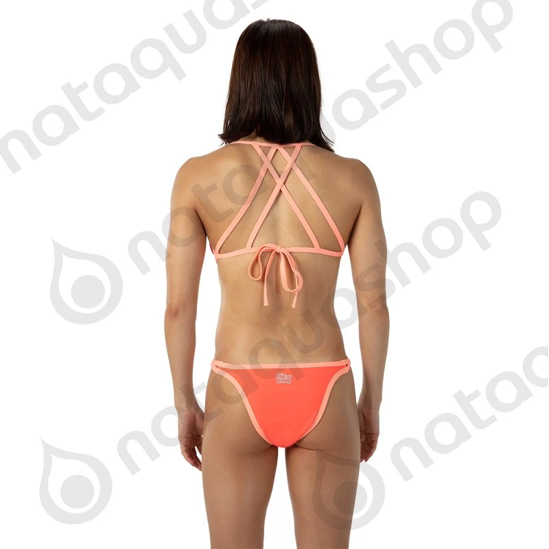 Ce modèle de 2 pièces propose une coupe mettant en avant la silhouette de la femme, avec un haut large devant pour un bon maintient et des double bretelles fines et croisées mais aussi un bas avec des bandes se croisant sur le côté du maillot.